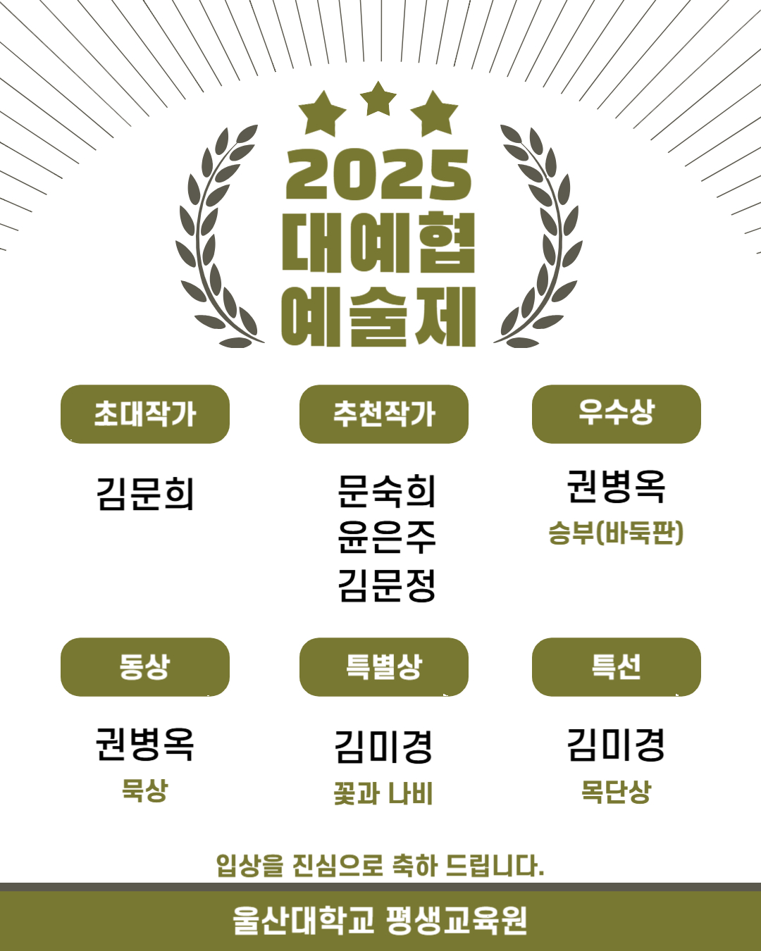 2025 대예협 예술제 한지공예 부문 입상 한지공예테라피(김문희) 대한민국예술인협회에서 진행한 '2025 대예협 예술제' 평생교육원 수강생분들의 한지공예 부문 수상소식입니다. 울산대학교 평생교육원 |