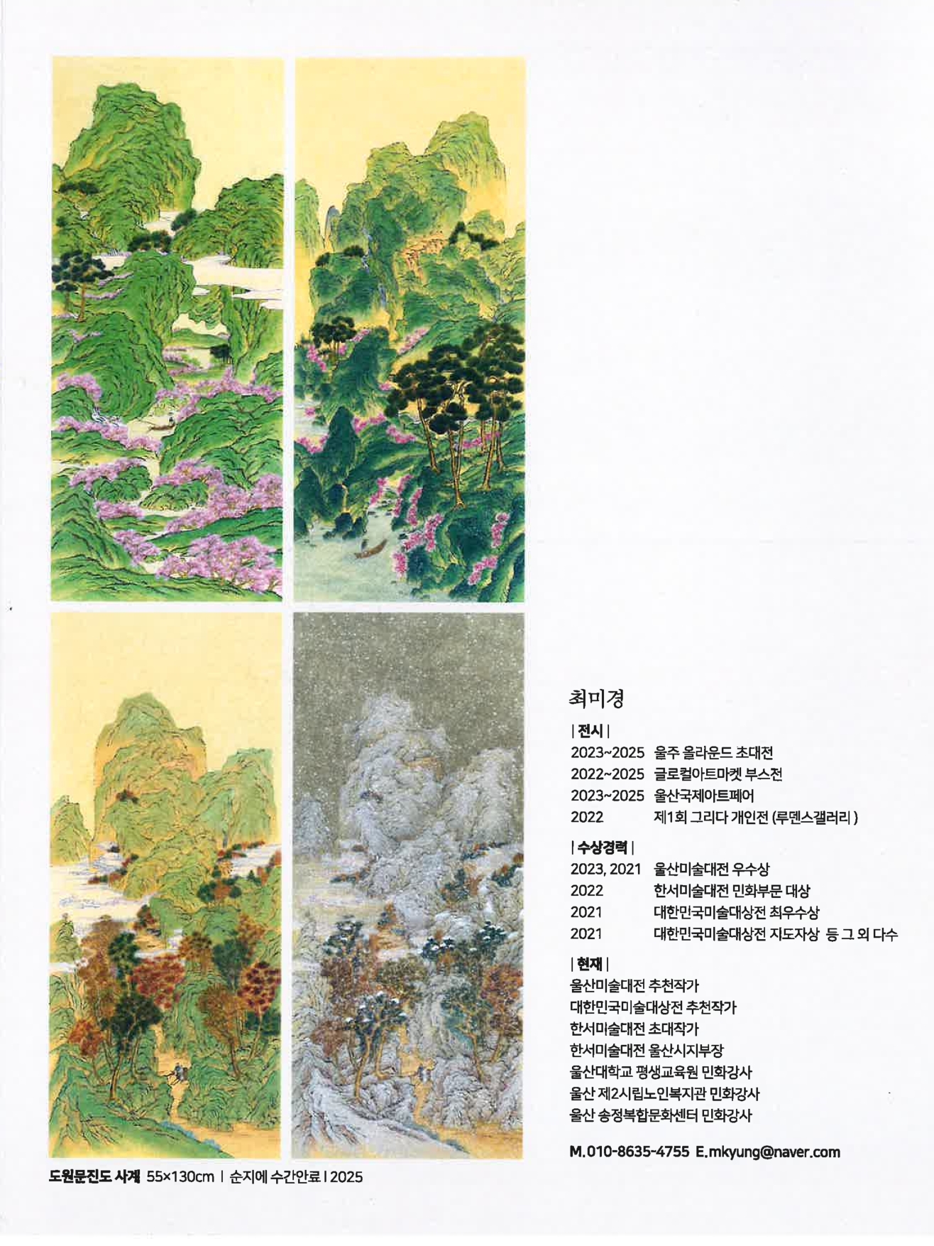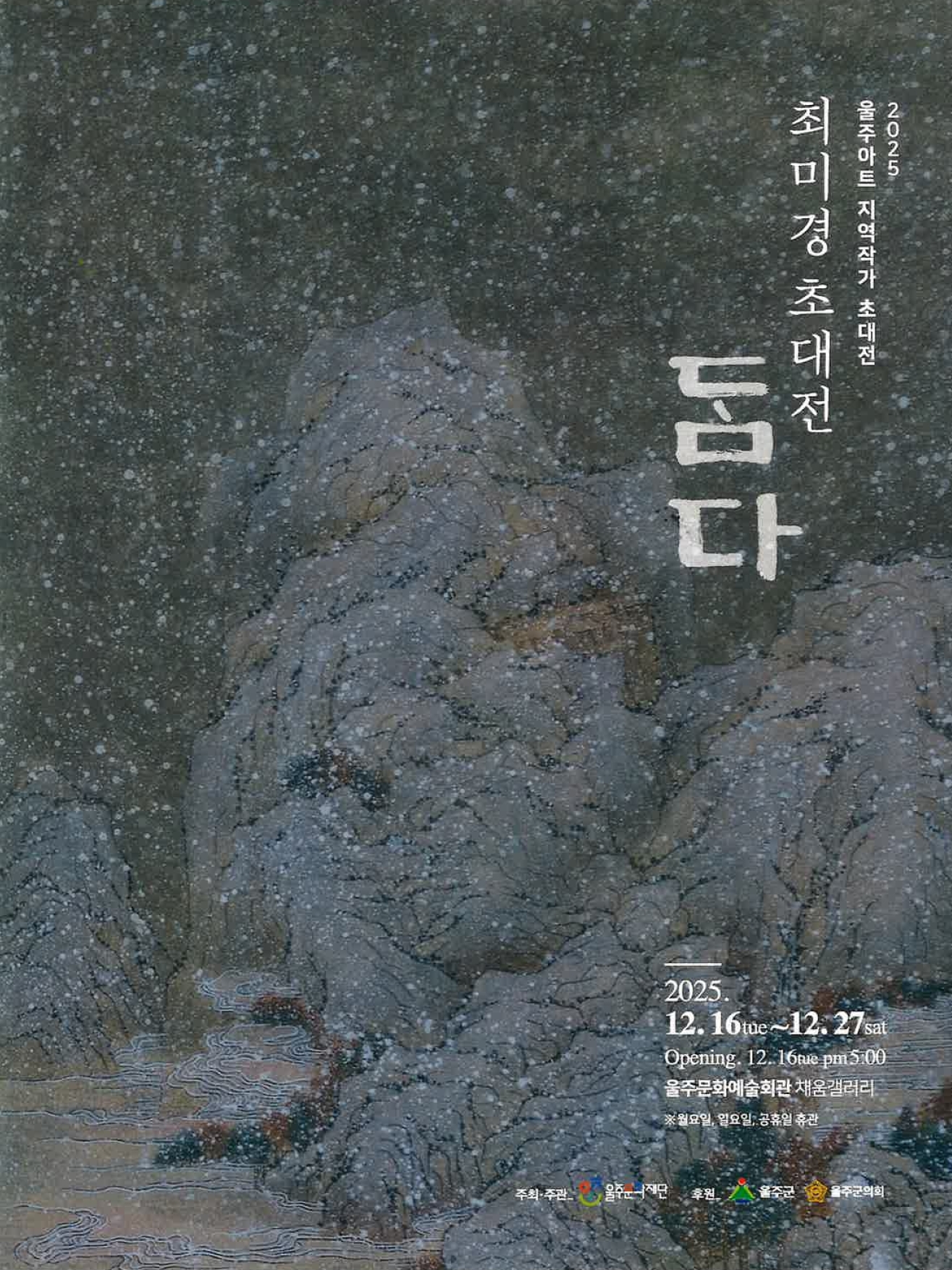 2025 울주아트 지역작가 초대전 <최미경 초대전 '담다'> 일자: 2025. 12. 16.(화) ~ 12. 27.(토) 장소: 울주문화예술회관 채움갤러리 (월요일, 일요일, 공휴일 휴관)
