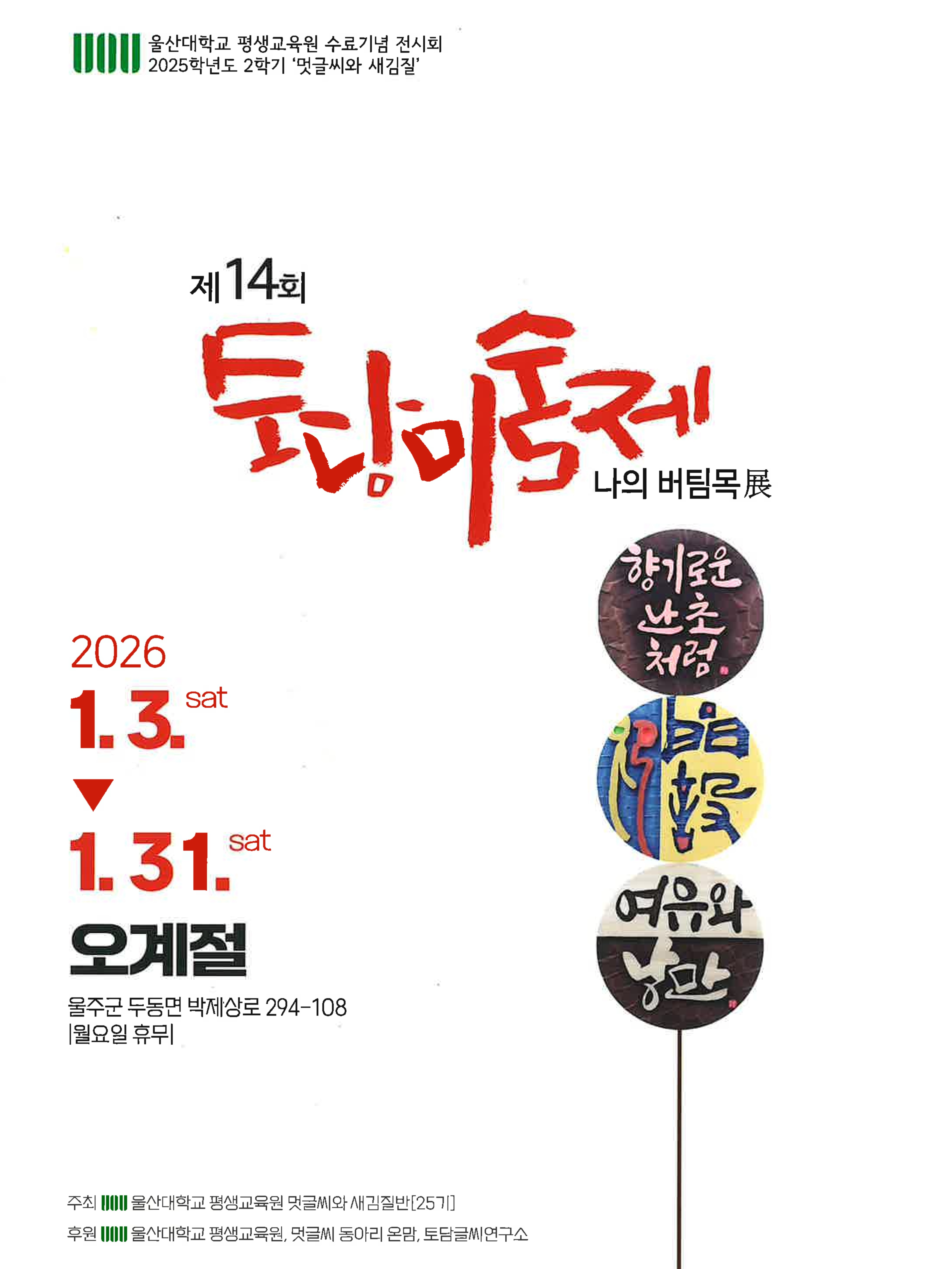 제14회 토담미술제 나의 버팀목 展 기간: 2026. 1. 3.(토) ~ 1. 31(토) 장소: 오계절(울산 울주군 두동면 박제상로 294-108) 월요일 휴무 위 기간 동안 감상 하실 수 있으니 많은 관심 부탁 드립니다. 감사합니다. 울산대학교 평생교육원 |