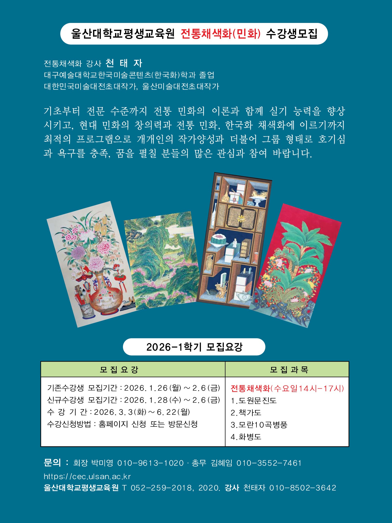 천태자 강사님의 지도아래 전통채색화반 수강생들의 수료전인 [열세 번째 민화와 채색화전] 전시소식입니다.