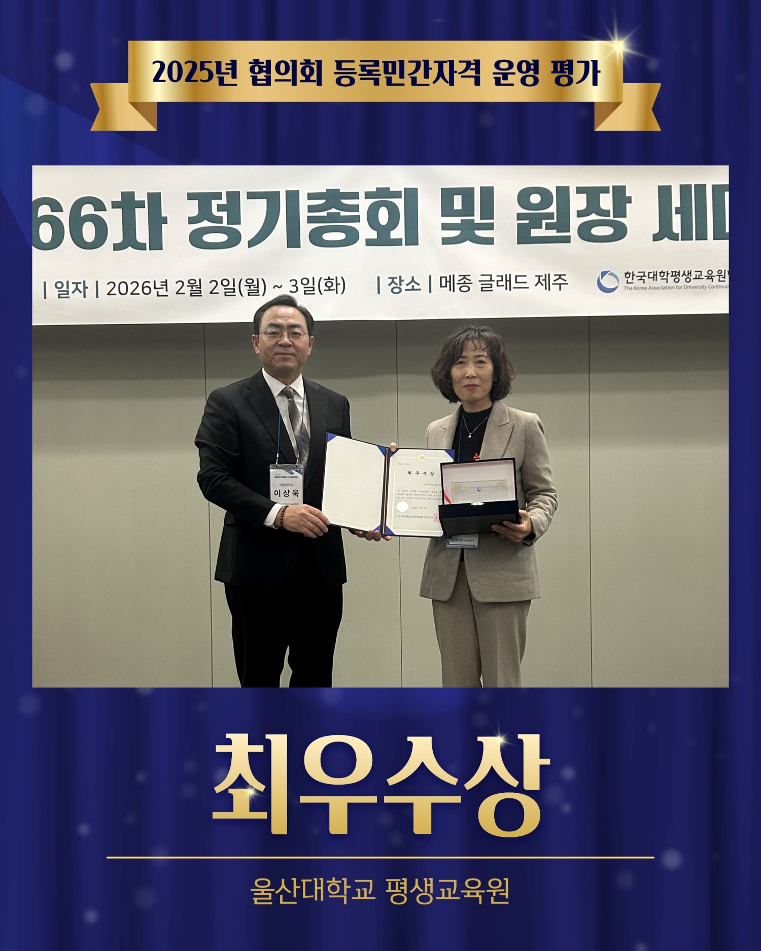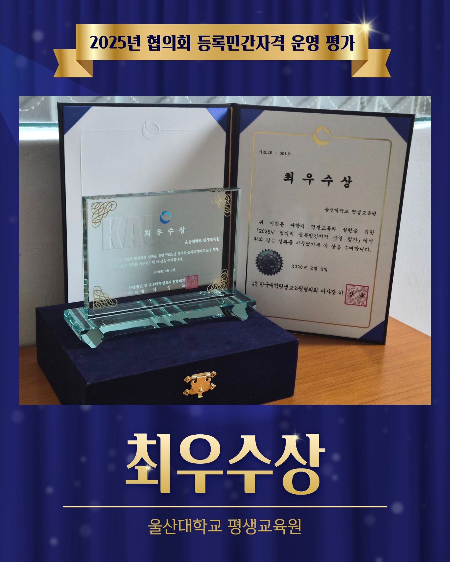 | 울산대학교 평생교육원 [2025년 협의회 등록민간자격 운영 평가] '최우수상' 수상 소식 | |||||