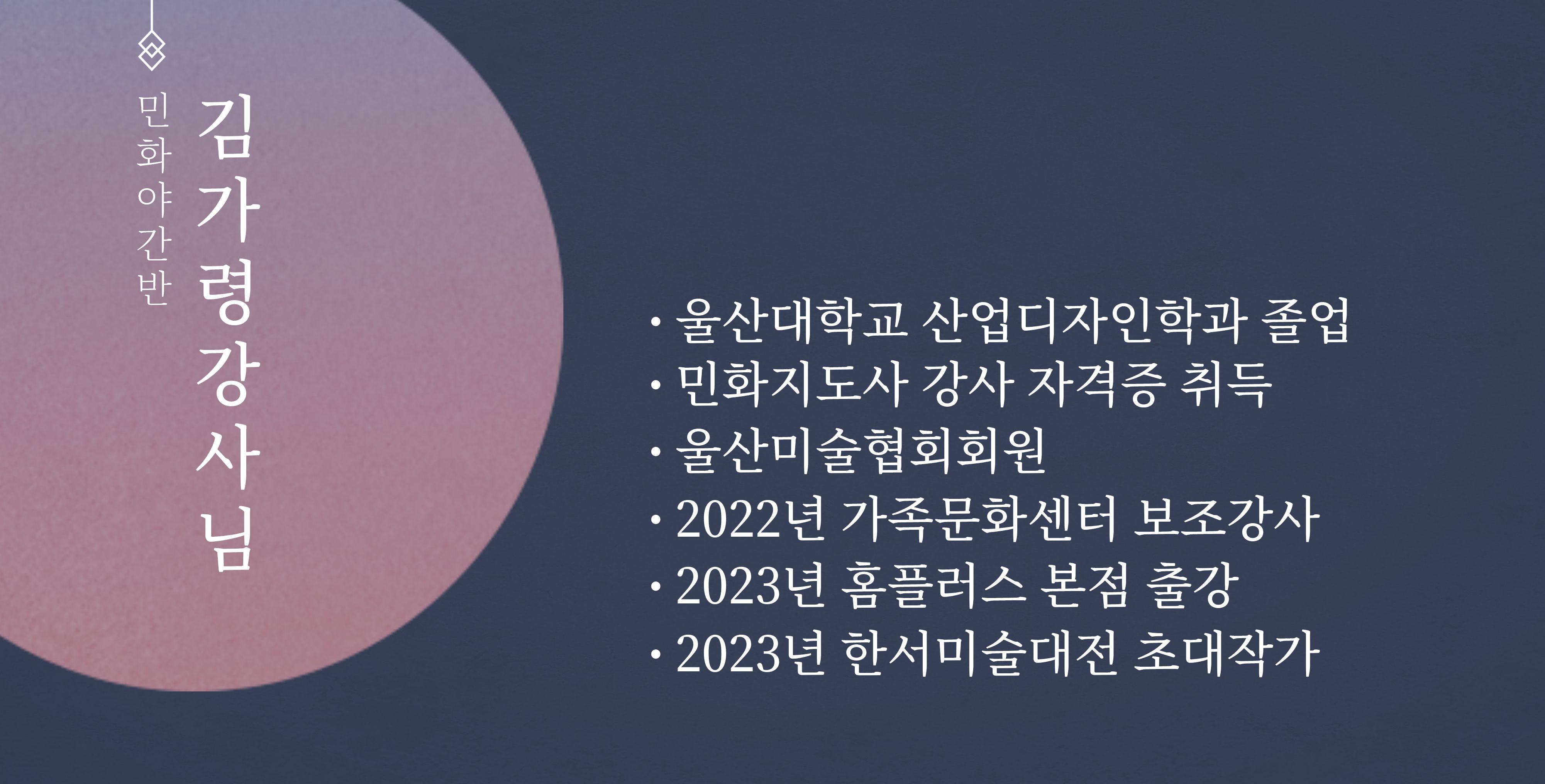 *2026-1학기 강의기간: 2026. 3. 3.(화) ~ 6. 16.(화) 조선시대부터 내려오는 전통민화를 기반으로 창작민화와 현대민화에 이르기까지 다양하게 민화의 세계를 접할 수 있도록 그룹으로 지도하고 행복코드 가득한 민화를 통해 성취감도 향상시키고 민화작가의 길로 가는데 목적을 둔 수업입니다. 울산대학교 평생교육원 |