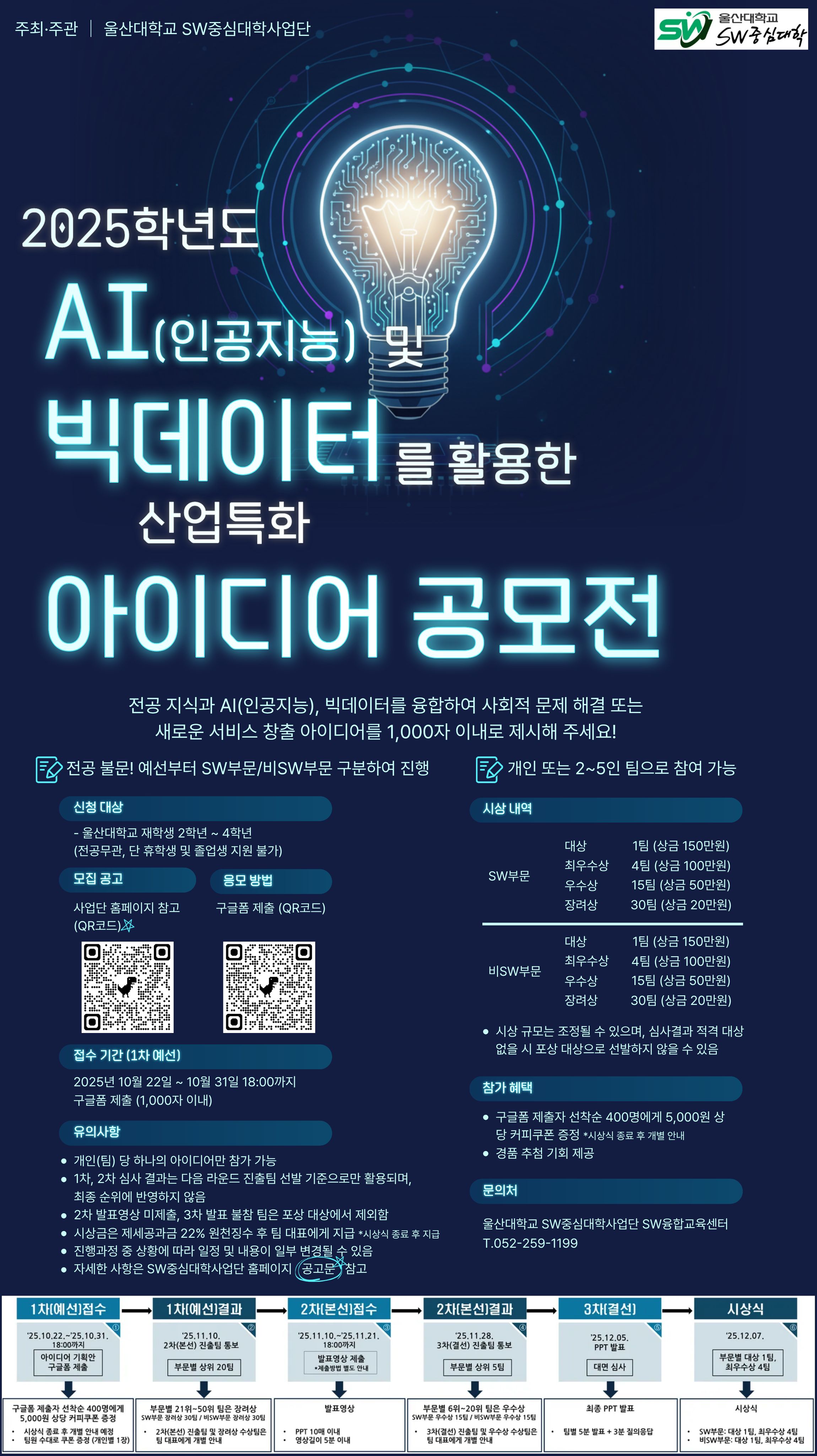 | [SW중심대학사업단] 2025학년도 AI(인공지능) 및 빅데이터를 활용한 산업특화 아이디어 공모전 개최 | |||||
