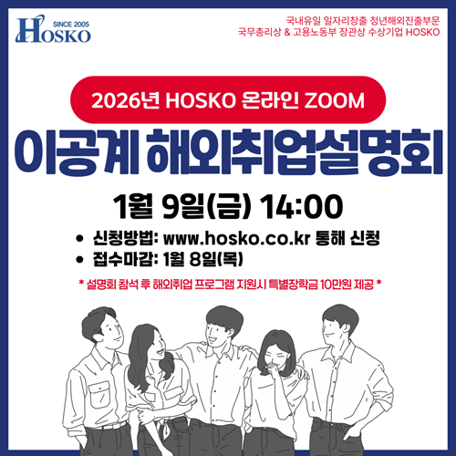 2026년 호스코 온라인 이공계 해외취업 설명회를 안내드리고자 합니다.