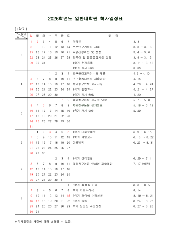 2026학년도 일반대학원 학사일정표&학위청구논문심사 일정 안내 드리오니 붙임파일을 참고하시기 바랍니다. 2025. 12. |