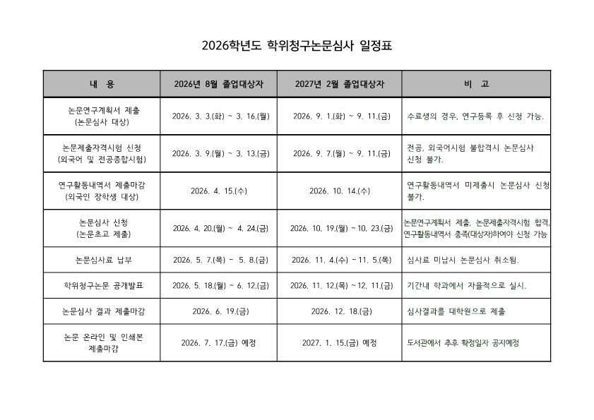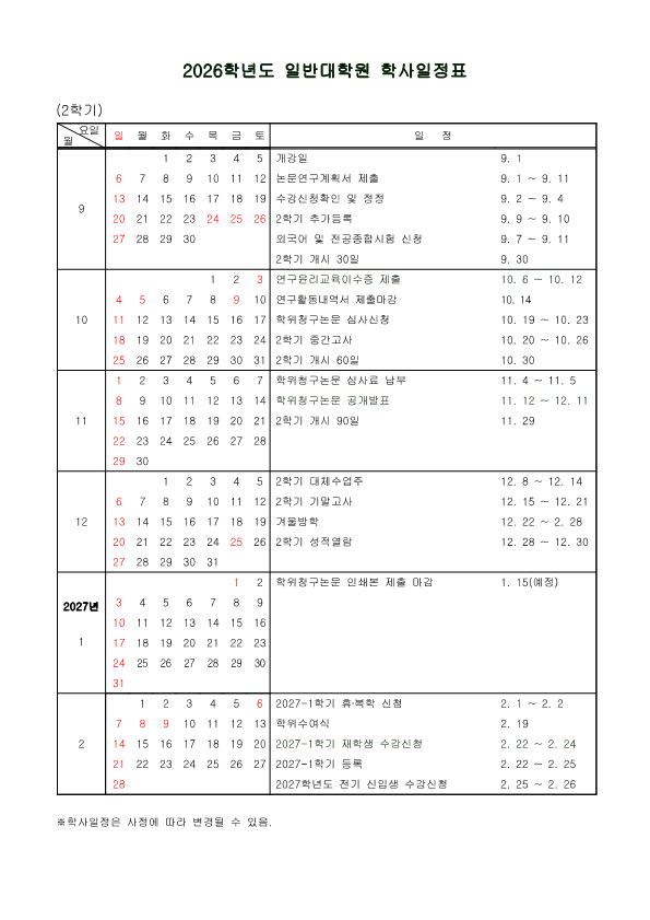 | 2026학년도 일반대학원 학사일정표&학위청구논문심사 일정 안내 | |||||||||||