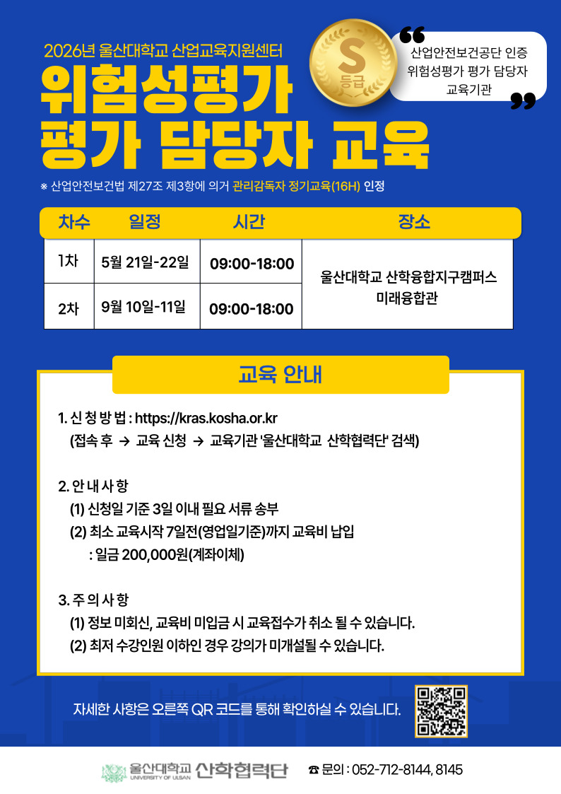 • 신청방법 : 상단 바로가기 링크(https://kras.kosha.or.kr/) 접속 → 교육기관 '울산대학교 산학협력단' 검색 후 교육신청